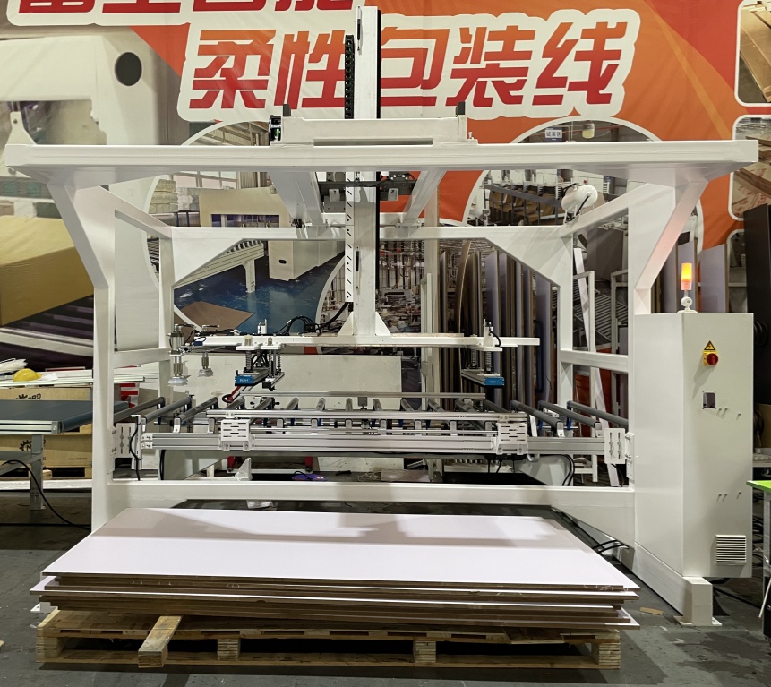 1. लोडिंगची तयारी: कामगार उपकरणाच्या फीडिंग रॅकवर-प्रक्रिया केलेल्या लाकूड-आधारित पॅनेलचे संपूर्ण पॅलेट ठेवतात. रॅकचे लिफ्टिंग प्लॅटफॉर्म स्वयंचलितपणे प्रारंभिक हडपण्याच्या उंचीवर समायोजित करते.